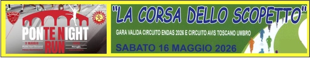 Nel prossimo mese di maggio si svolgeranno due manifestazioni a cui la Podistica Volumnia Sericap collabora direttamente, la 4a edizione della PONTE NIGHT RUN il 3 maggio (gara nazionale FIDAL organizzata dalla nostra consorella Atletica Il Colle) e la 12a edizione della mitica CORSA DELLO SCOPETTO, organizzata dal nostro grande Paolino Bracardi, il 16 maggio. Interveniamo numerosi (almeno allo Scopetto, perché alla Ponte Night Run noi tesserati Endas – figli di un dio minore – possiamo partecipare solo se in possesso anche di Runcard).